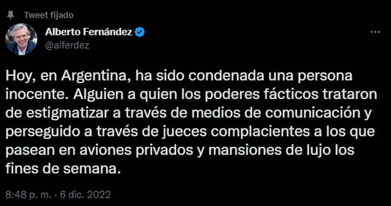Fernández calificó en Twitter a la vicepresidenta como "alguien a quien los poderes fácticos trataron de estigmatizar a través de medios de comunicación y perseguido a través de jueces complacientes a los que pasean en aviones privados y mansiones de lujo los fines de semana".