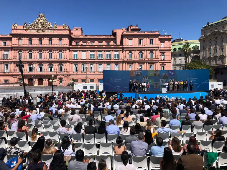 Con la ausencia de dos miembros importantes de su Gabinete: el ministro de Economía, Sergio Massa, y el de Interior, Eduardo "Wado" de Pedro, el mandatario encabezó un acto en el Parque Colón, detrás de la Casa Rosada, con motivo del tercer aniversario de su asunción.