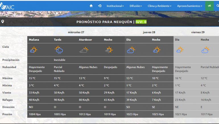 La AIC pronosticó que continuará ingresando aire frío y húmedo desde el Océano Pacífico con lluvias y nevadas en toda la cordillera, mientras que habrá lluvias y neviscas en meseta centro de Neuquén y región sur rionegrina. En los valles meseta y costa estará inestable con períodos de viento especialmente hoy con ráfagas fuertes.