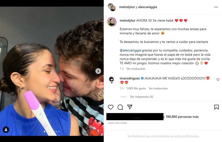 Después de cientos de rumores de embarazo, llegó la confirmación oficial. Finalmente, Alex Caniggia y Melody Luz se convertirán en padres. “¡Ahora sí, se viene bebé!”, escribieron en un posteo compartido que publicaron en sus cuentas de Instagram.