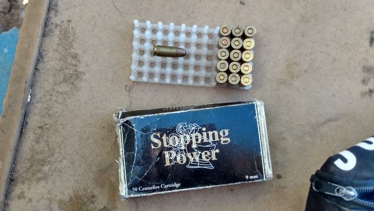 También secuestraron una caja de color negro con la inscripción “Stopping Power 9 mm” con 16 municiones de calibre 9 mm, una escopeta sin marca, culata de madera, y sin municiones que sería una replica.