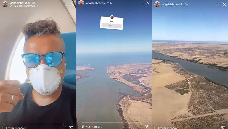Así fue que se mostró en el aeropuerto de Ezeiza, caminó a abordar el avión. Su siguiente historia fue desde arriba de la nave, mostrando un paisaje conocido para los residentes de la costa rionegrina: la desembocadura del río negro en el océano atlántico.