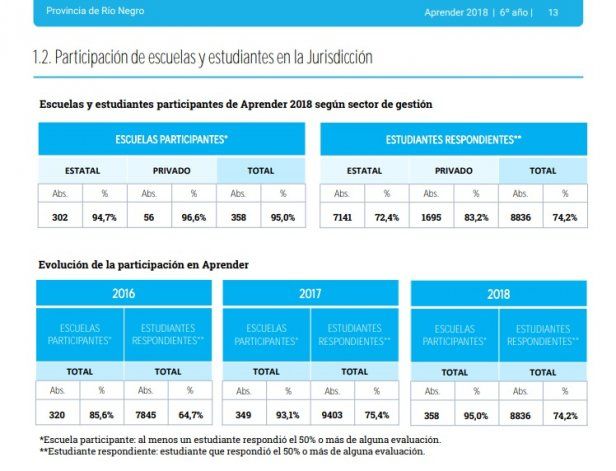 En la prueba Aprender 2018 participaron más de 8 mil estudiantes de 358 establecimientos rionegrinos. El 94 por ciento de esos colegios fueron de gestión pública, mientras que el 5,7 restante se trató de establecimiento privados.