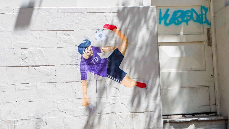 Los detalles más llamativos están en su rostro, por las tres estrellas que aparecen allí (en relación a la tercera copa que gana Argentina), y en su pierna rota, ya que por la posición en la que está y la pelota que se le agregó, pareciera estar llevando a cabo un movimiento muy específico de este deporte: una chilena.
