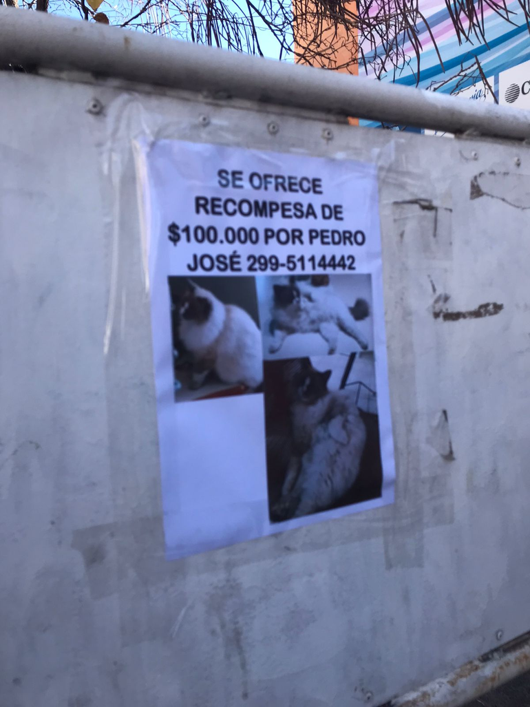 En principio, la oferta original, la retribución económica para quien lo encuentre u ofrezca pistas que permitan dar con el gato era de 100 mil pesos pero ahora asciende a 150 mil pesos ya que pasan las semanas y Pedro no aparece. Y la desesperación crece.