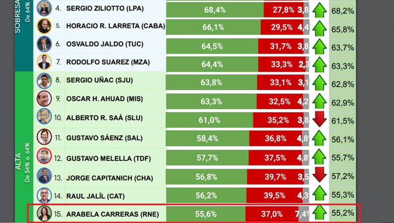 La consultora especializada en estudios sociales analizó la imagen de los 24 gobernadores del país y destacó la ubicación de Arabela Carreras dentro del grupo de los mandatarios con “alta imagen”, manteniéndose por encima de los 50 puntos como lo hizo durante toda su gestión.