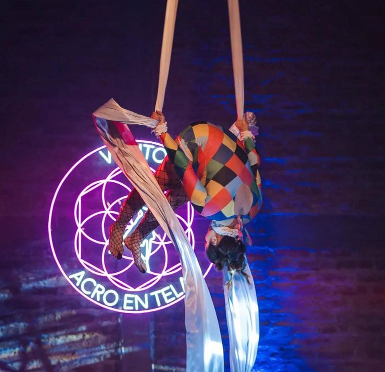 La escuela Viento Acrobacia inauguró en 2020, pero nació hace aproximadamente una década, de la mano de Belén Garrido, quien practicó telas durante mucho tiempo, antes de convertir su pasión en vocación.
