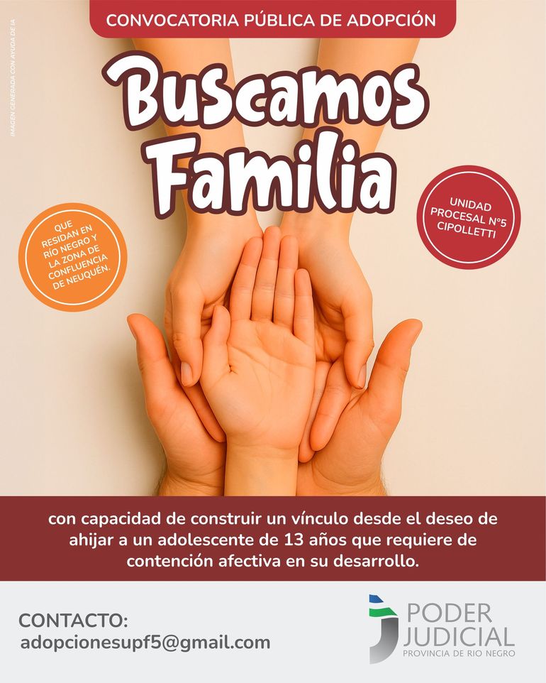 El Juzgado de Familia de Cipolletti lanzó una convocatoria pública para encontrar una familia que adopte a un adolescente de 13 años. Se trata de un llamado excepcional destinado a familias residentes en la Provincia de Río Negro o en la zona de Confluencia de Neuquén, con la capacidad y el deseo de acompañar afectivamente a un joven en una etapa clave de su desarrollo emocional.
