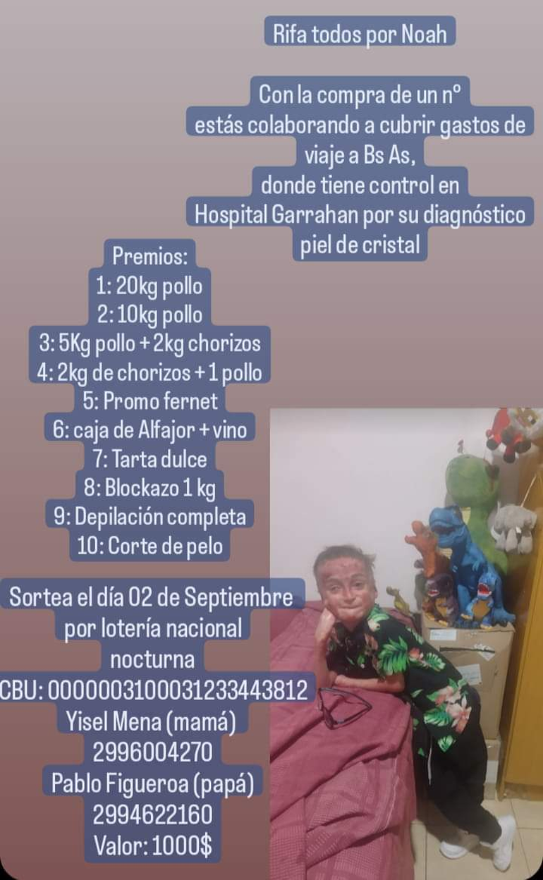 "Nos quedan un par de números apenas, la gente colabora y estamos super agradecidos. El valor es de 1000 pesos, sortea el 2 de septiembre en la nacional nocturna", destaca la mujer que vive pendiente de su nene.