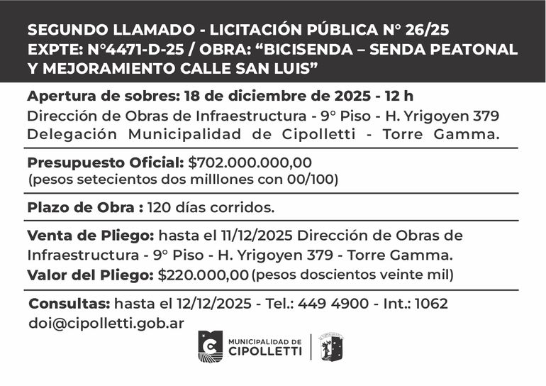 Tras la declaración de licitación desierta, la Municipalidad dispuso un nuevo período para la adquisición de pliegos y para la presentación de ofertas. Las empresas interesadas podrán retirar la documentación hasta el 11 de diciembre, mientras que la apertura de sobres quedó reprogramada para el 18 de diciembre a las 12, en la Dirección de Obras e Infraestructura del Palacio Municipal.