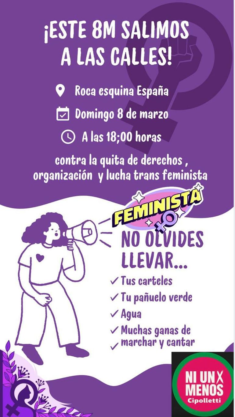 En Cipolletti, la marcha se realizará el domingo 8 de marzo desde las 18 horas, la convocatoria será en la Plaza de la Justicia, ubicada en la esquina de Roca y España. Desde ese lugar, iniciará una movilización que incluirá la presencia de agrupaciones feministas, asociaciones barriales, partidos políticos y mujeres autoconvocadas junto a banderas y cánticos.