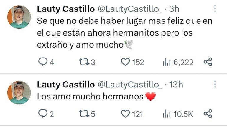 El joven, de 17 años de edad, posteó en sus perfiles: "Sé que no debe habar lugar más feliz en el que están ahora hermanitos pero los extraño y amo mucho". Unas horas antes, también utilizó el mismo medio para expresarse con un "los amo mucho, hermanos".