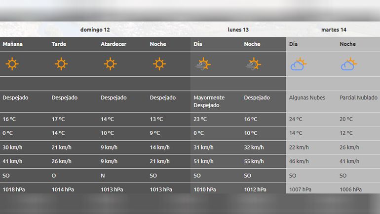 Según anticipa el Servicio Meteorológico Nacional, la temperatura máxima esperada para este domingo 12 de noviembre es de 19 grados centígrados y cielo despejado. Si bien la máxima no superará los 20, el descenso en la intensidad del viento permitirá disfrutar de la tarde primaveral.