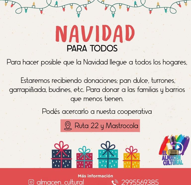 El Almacén recibe donaciones de pan dulce, turrones, budines, garrapiñadas y otros productos navideños que serán distribuidos en distintos barrios. El punto de recolección es la sede del espacio, ubicada en Ruta 22 y Mastrocola. Quienes quieran colaborar también pueden contactarse al 299-5569385.