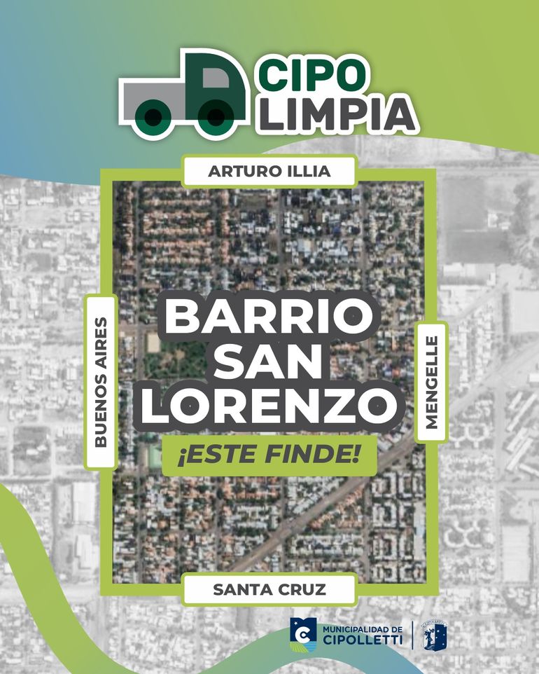 El programa Cipo Limpia, impulsado por la Secretaría de Servicios Públicos de la Municipalidad de Cipolletti, realizará este viernes 8 de agosto y el sábado 9 un nuevo operativo de recolección de residuos voluminosos. El recorrido se centrará en el cuadrante delimitado por las calles Buenos Aires, Santa Cruz, Mengelle e Illia, y funcionará en dos jornadas: de 8 a 17 horas el viernes y de 8 a 12 horas el sábado.