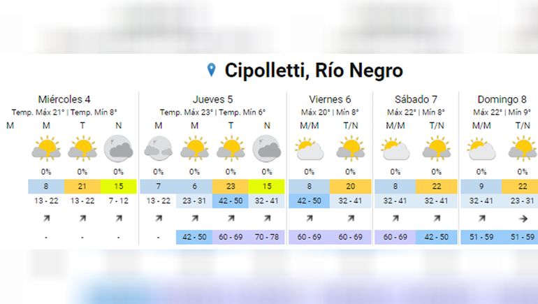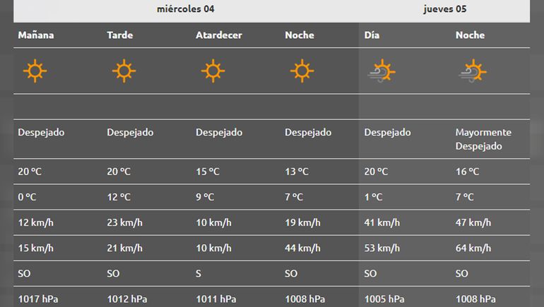 Los días jueves, viernes y sábado se cumplirá el pronóstico de vientos. La velocidad promedio del viento será cercana a los 50 kilómetros por hora, mientras que las ráfagas superarán los 65 kilómetros. Además, se esperan cielos parcialmente cubierto durante el resto de la semana.