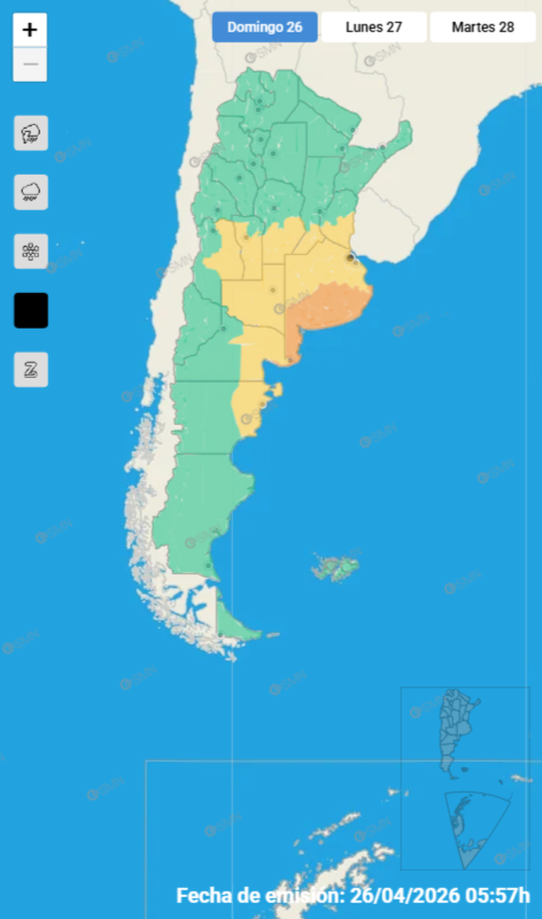 La información oficial del Servicio Meteorológico Nacional destaca que rigen alertas por fenómenos meteorológicos que pueden afectar la vida cotidiana. Hay alerta amarilla en la mitad del territorio provincial, desde Choele Choel hasta la costa atlántica y Viedma.