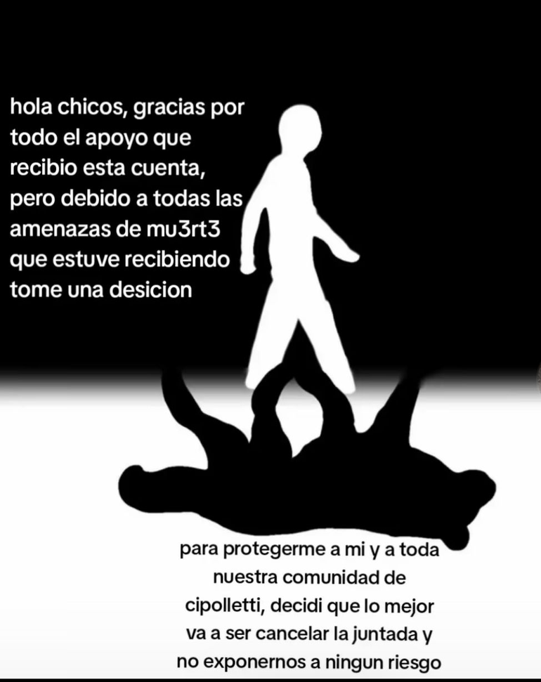 "Hola chicos, gracias por todo el apoyo que recibió esta cuenta. Pero debido a todas las amenazas de muerte que tuve tome una decisión para protegerme a mí y a toda nuestra comunidad de Cipolletti. Decidí que lo mejor va a ser suspender la juntada y no exponernos a ningún riesgo", expresó la administradora de la cuenta La Therian de Río Negro en Tik Tok.