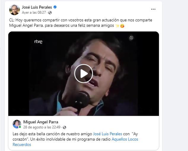 "Hoy queremos compartir con vosotros esta gran actuación que nos comparte Miguel Angel Parra, para desearos una feliz semana amigos", fue la reacción de Perales, ofreciendo así el hit que subió Parra a sus seguidores.
