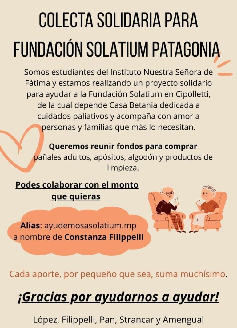 Un grupo de alumnos de quinto año del Instituto Nuestra Señora de Fátima de Cipolletti decidió transformar una actividad escolar en una verdadera acción solidaria. Lo que comenzó como un trabajo de la materia Formación Religiosa terminó convirtiéndose en una campaña para ayudar a la Fundación Solatium Patagonia, institución que sostiene a Casa Betania, dedicada al acompañamiento integral de personas que atraviesan enfermedades terminales y de sus familias.