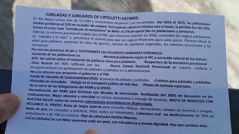 Los puntos difundidos por los jubilados cipoleños se enmarcan en demandas que ya se escuchan en diferentes provincias. En el volante que circuló esta mañana, se detalla que entre 2016 y 2025 las jubilaciones medias en Río Negro perdieron un 52% de su poder de compra. En el caso de quienes cobran la mínima más el bono, la caída fue del 32%.
