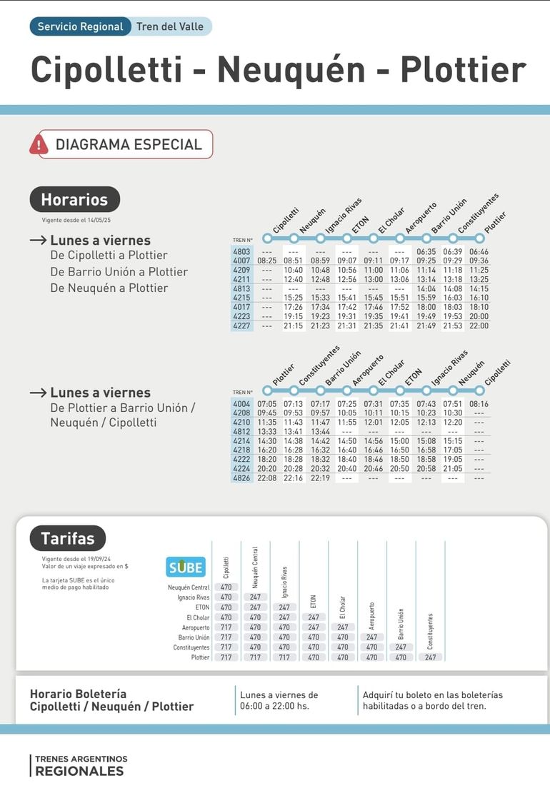 Según confirmaron desde el Tren del Valle, el tren deberá, hasta nuevo aviso, utilizar un diagrama especial de horarios. Explicaron que la cuadrilla no llegó a enderezar la vía para que el tren pueda salir de Neuquén con normalidad a las 7:51.
