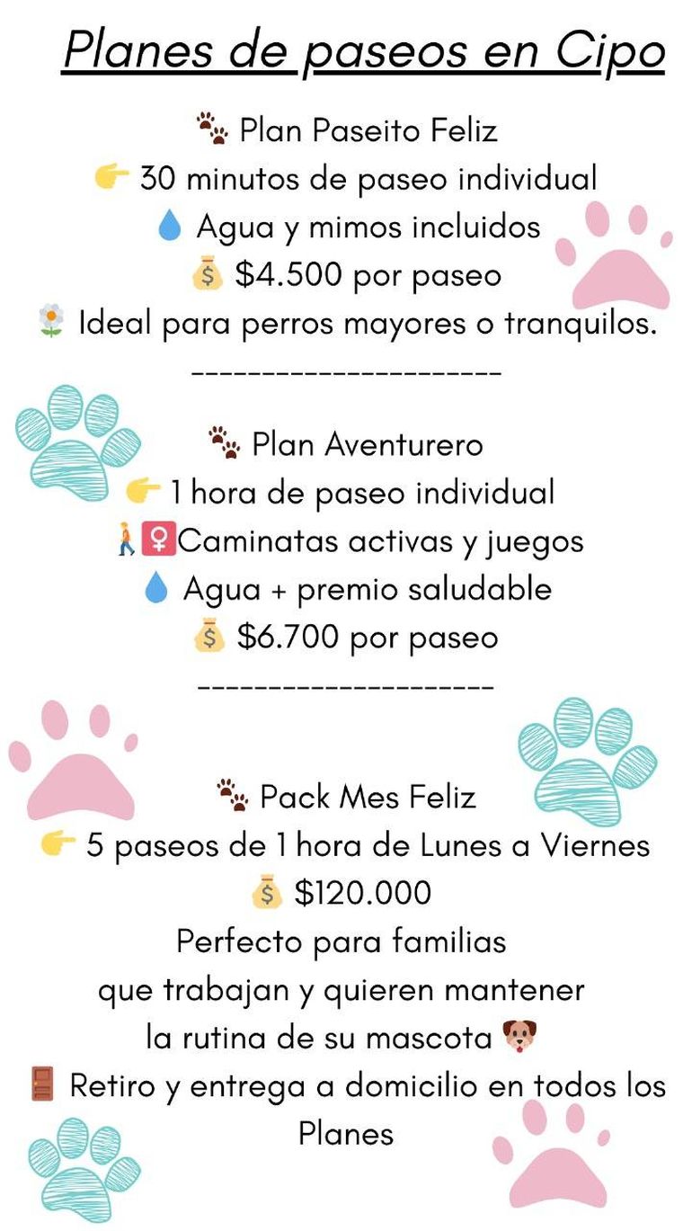 Respecto a los precios, revela: “Tenemos el paseo feliz: media hora de paseo individual $ 4.500. El plan aventurero: 1 hora de paseo $ 6.700 pesos. Y el ‘pack mes feliz’: de lunes a viernes, 1 hora por día, 120 mil pesos. Una chica que adquirió el plan tiene dos mascotas, le hicimos descuento del 10 %”.