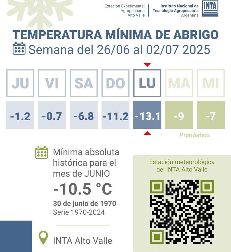 Según dio a conocer el INTA Alto Valle, este lunes se registró una temperatura mínima de -13.1 °C, lo que establece un nuevo récord de temperatura mínima para la zona, superando la marca histórica del 30 de junio de 1970 donde se habia registrado -10.5 °C, y los -12.9 °C del 8 de julio de 2007.