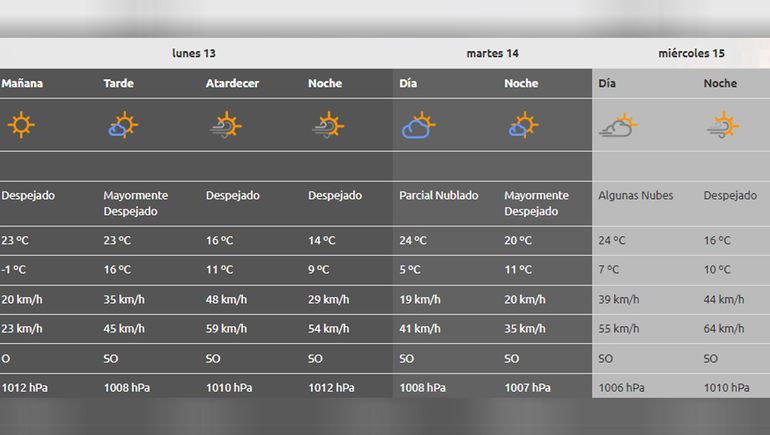 Durante el miércoles se prevé cielo con algunas nubes y ventoso. La temperatura mínima será de 7 grados y la máxima de 24, con ráfagas de hasta 55 km/h. A la noche la mínima prevista es de 10 grados y la máxima de 16, con ráfagas de 64 km/h.