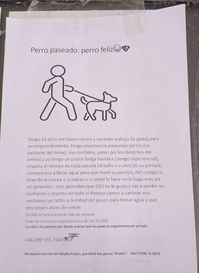 “Perro paseado: perro feliz... Tengo 14 años, me llamo Ramiro y necesito trabajo (la plata) para un emprendimiento. Tengo experiencia paseando perros (sé bastante del tema), soy confiable, peleo por los derechos del animal y tengo un pastor belga hembra (¡tengo experiencia!)" expresa el anuncio.