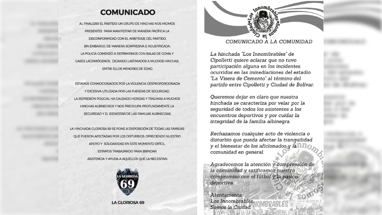 Luego de los incidentes acontecidos tras el partido entre Cipo y Ciudad de Bolívar, la institución y las facciones de la parcialidad albinegra difundieron comunicados.
