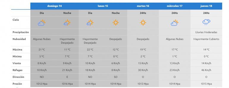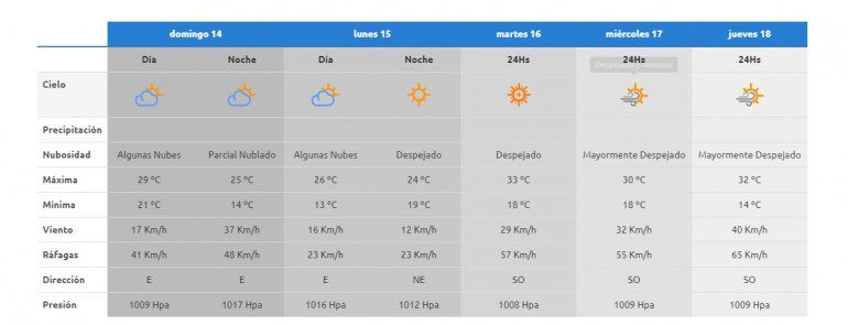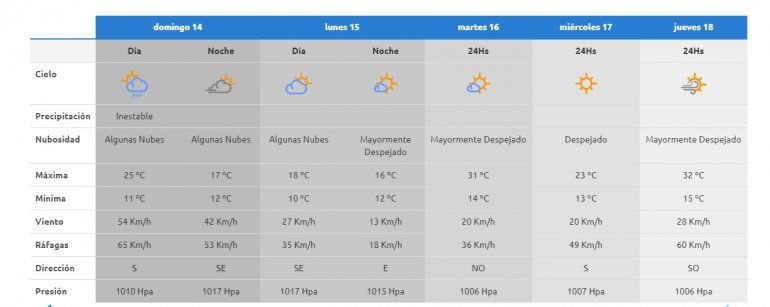 Para el sábado, la AIC pronosticó condiciones similares con algo de viento al atardecer. El domingo la máxima no será tan alta y alcanzará los 29°C pero sigue el buen tiempo, sin vientos fuertes ni tormentas. Lunes y martes, el sol brillará a pleno con máximas de 26 y 33 grados, respectivamente. Para el miércoles y jueves se intensifica el viento, con ráfagas de hasta 65 kilómetros por hora.
