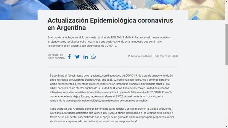 Este sábado la cartera sanitaria nacional informó a través de un comunicado que “en el día de la fecha, el servicio de virosis respiratoria INEI ANLIS Malbrán ha procesado nueve muestras arrojando como resultados ocho negativas y una positiva, siendo esta la muestra que confirma el fallecimiento de un paciente con diagnóstico de COVID-19”.