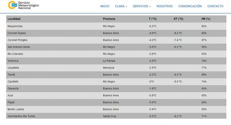 Según indicaron desde el Servicio Meteorológico Nacional en el ránking de las temperaturas de Argentina más baja puso en primer lugar a Maquinchao con -6,5 C° y 80 por ciento de humedad. Le siguieron Coronel Suarez (Buenos Aires) con -4.9 ºC y una sensación térmica de -8.2 ºC, Coronel Pringles (Buenos Aires) con -4.2 ºC y -7.4 de sensación, San Antonio Oeste (Río Negro) -3.6 ºC y -9.2 de sensación térmica, y Río Colorado (Río Negro) con -2.8 ºC.
