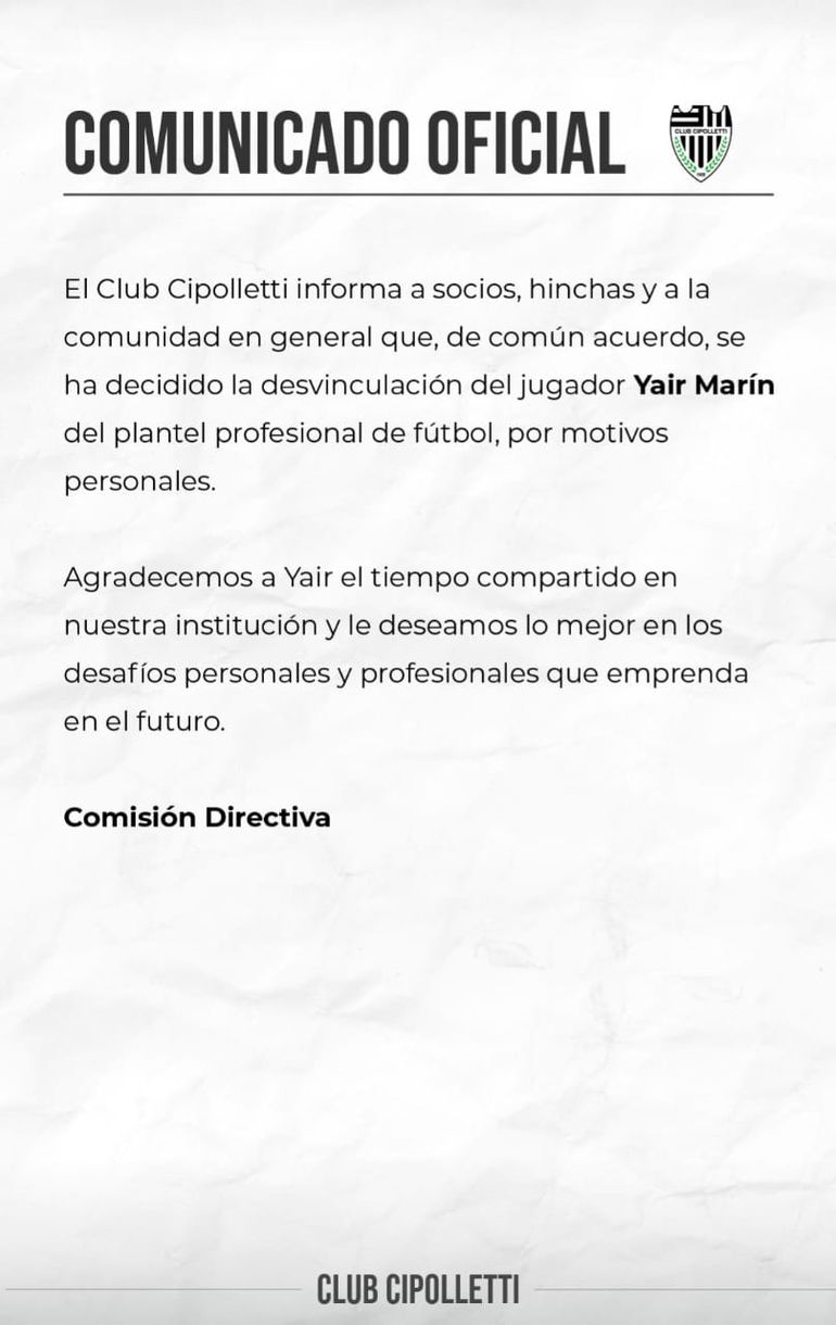 Luego del fin de semana libre que se le otorgó al plantel, Marín no rindió como se esperaba y hasta se ausentó de al menos una práctica. Ante este panorama, se decidió por separarlo del grupo en las últimas sesiones y en el cierre de la semana el jugador se habría retirado de la pensión donde vivía junto a un reducido grupo de jugadores desde su llegada a Cipolletti.