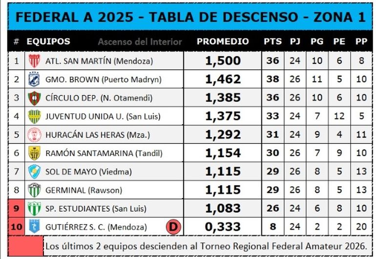 Su escolta es San Martín de Mendoza, que derrotó al ya descendido Gutiérrez de la misma provincia, por 2 a 0.