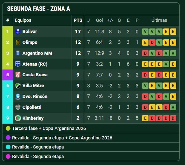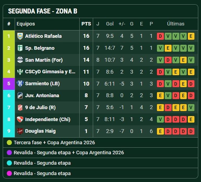 En el restante, Juventud Antoniana (8) sacó un punto ante Douglas Haig (1) en Pergamino y podría llegar a la Copa Argentina si supera a Sarmiento (10). Gimnasia de Concepción del Uruguay (11), que tuvo fecha libre, por ahora está logrando los dos objetivos pero los tiene que defender en la última.