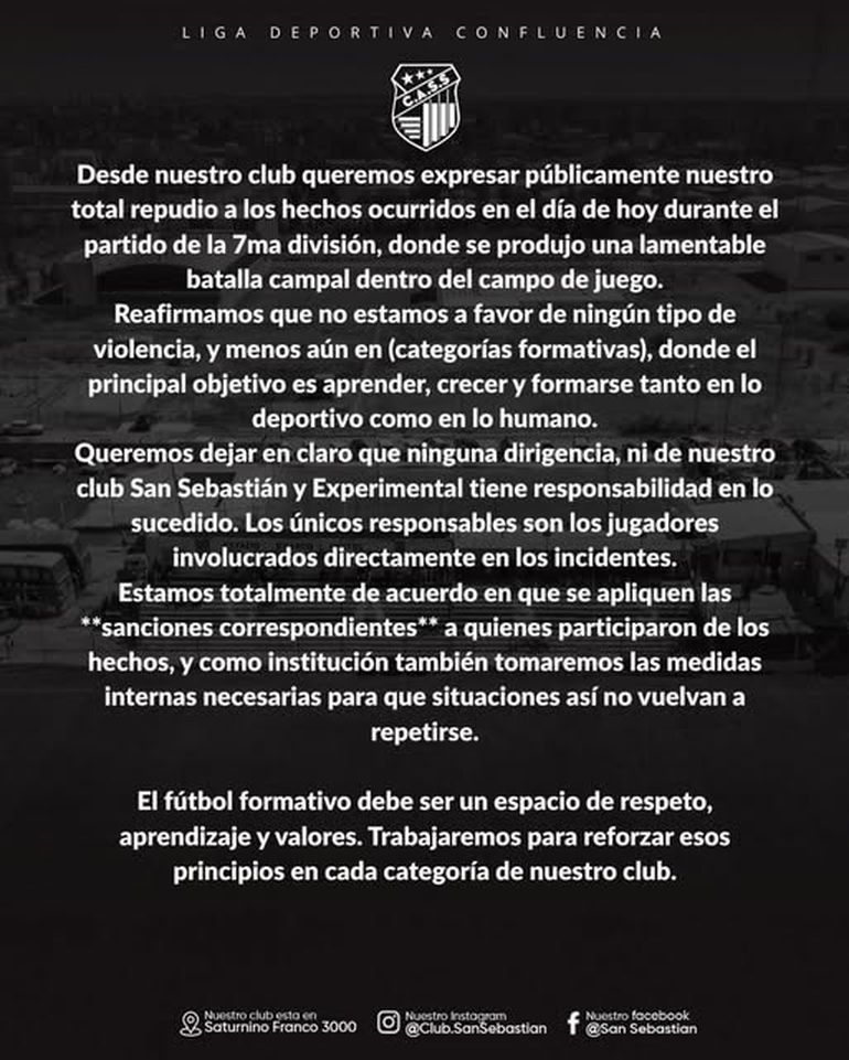 Tras viralizarse los incidentes, el Club San Sebastián emitió un fuerte comunicado en el que expresó su repudio: “Desde nuestro club queremos expresar públicamente nuestro total repudio a los hechos ocurridos (…) donde se produjo una lamentable batalla campal dentro del campo de juego. Reafirmamos que no estamos a favor de ningún tipo de violencia, y menos aún en categorías formativas”.