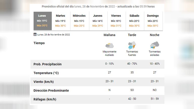 “Se mantiene la probabilidad de tormentas sobre la región. Calor el lunes e inestabilidad hacia el este de Río Negro (Máxima de 36°); por lo que la Dirección de Protección Civil recuerda a los vecinos y vecinas de la ciudad que está prohibido bañarse en los canales de riego”, expresaron desde el gobierno comunal.