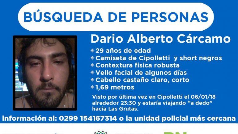 Dario Alberto Cárcamo tiene 29 años y fue visto por última vez a las 23.30 del sábado en Cipolletti cuando informó a su familia y amigos que se iba a hacer dedo para viajar hacia Las Grutas. El Ministerio Público Fiscal y la Subcomisaría 79° de la ciudad iniciaron una investigación para dar con su paradero porque nunca llegó a destino.
