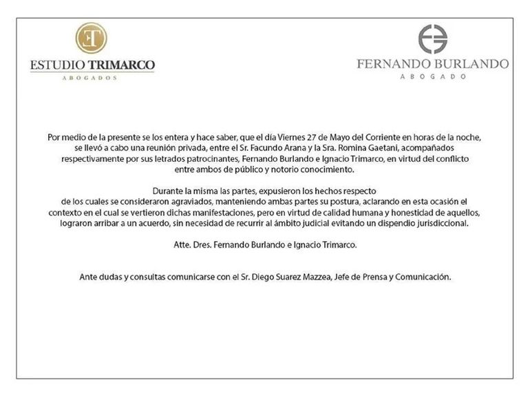 Este domingo Mazzea compartió en su cuenta de Instagram un extenso comunicado oficial en el que confirma el encuentro el pasado viernes entre Romina Gaetani y Facundo Arana con sus respectivos letrados patrocinantes en virtud del conflicto entre ambos, de público y notorio conocimiento.