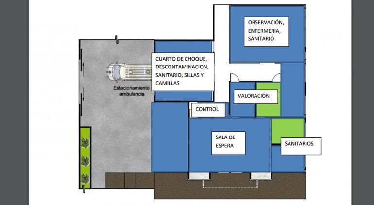 Según la primera etapa del proyecto el diseño cuenta con un área de urgencias que contempla una sala de observación con 4 camas, cuarto de choque, de enfermería, área de descontaminación, una sala de espera para 20 personas, cuartos sépticos y de aseo, entre otros. El área de hospitalización incluye la zona de internación de adultos con disponibilidad para 20 camas, un cuarto de aislamiento con 1 cama, área de internación pediátrica con 6 camas, cuarto de neonatos con 3 camas cunas, sala de espera para 10 personas, y cuartos sépticos, de aseo y de personal. También habrá un ala donde se ubicarán los laboratorios y sala de imágenes con áreas para toma de muestras sanguíneas y bacteriológicas, microbiología, archivo, salas de rayos X y vestidores. Además, contemplaron espacios para la instalación de los consultorios externos para medicina general y preventiva, un espacio para las áreas de gobierno y servicios generales como farmacia y cocina. Una área refrigerada funcionará como la morgue.