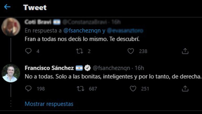Pero el intercambio no terminó allí. Otra usuaria respondió: "Fran a todas nos decís lo mismo. Te descubrí". Sánchez no guardó silencio y rápidamente escribió: "No a todas. Solo a las bonitas, inteligentes y por lo tanto, de derecha".