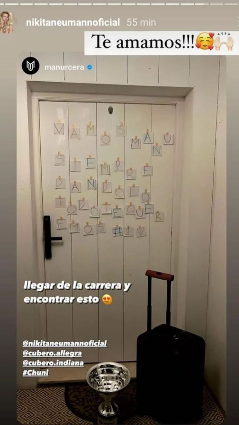 El mensaje en la puerta festejaba el triunfo de Urcera en la carrera y decía: “Vamos Manu. Siempre dándolo todo. Te queremos”. Luego, la modelo, aprovechó la publicación de su pareja y la compartió a través de sus Stories de Instagram donde escribió: “Te amamos”.