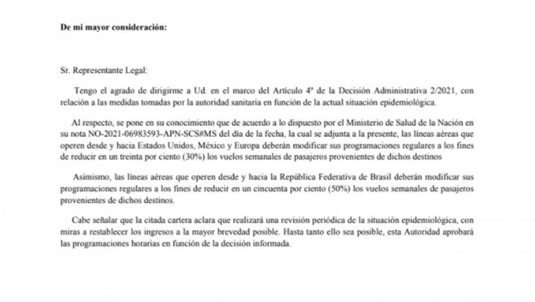 A través de una resolución de ANAC, el Gobierno dispuso una restricción de la cantidad de vuelos internacionales, por el aumento de los casos de coronavirus y la aparición de nuevas variantes del virus en diferentes países. De esta forma, las líneas aéreas que operan desde y hacia los Estados Unidos, México y Europa deberán modificar sus programaciones regulares y reducir un 30% los vuelos semanales a esos destinos; en tanto, las empresas que operan desde y hacia Brasil deberán reducir su cantidad de vuelos semanales a la mitad.