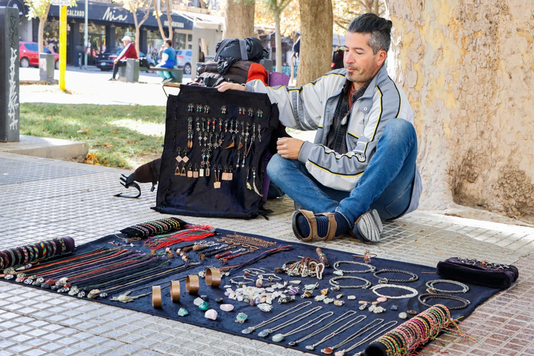 Tiene experiencia en las rutas y los campings sudamericanos con la mochila en el hombro. Se las rebusca con la artesanía y se define como un "mochilero más que un hippie". "Fui a Brasil varias veces, a Bolivia, a Paraguay, a Uruguay, casi toda Argentina. Defiendo mucho el arte general. Hago artesanías hace 15 años, de todo tipo: tejidos, cueros, madera, orfebrería, soldaduras en plata. En mi concepto el hippie es más informal en el trabajo, yo soy mochilero. Quizás tengo mucho de hippie en mi vida personal, pero mi trabajo no tiene nada de hippie. Hay trabajos míos por todo el mundo", saca chapa Leandro y posa para las fotos sobre la calle España.