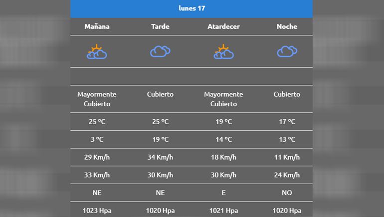 Este lunes, las nubes serán protagonistas en la región, pero sin posibilidad de lluvias. La mínima comenzará en los 3 grados pero el termómetro irá en aumento hasta alcanzar los 25 durante la tarde. El viento estará presente, pero de forma leve, con ráfagas que no superarán los 33 kilómetros por hora.