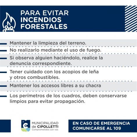 Desde el área de Protección Ciudadana se reitera la recomendación de no realizar actividades al aire libre, de ser posible. También, mantener la limpieza de los terrenos, tener cuidado con los acopios de leña y otros combustibles, observar árboles y ramas que puedan caerse y no utilizar el fuego para quemar residuos.