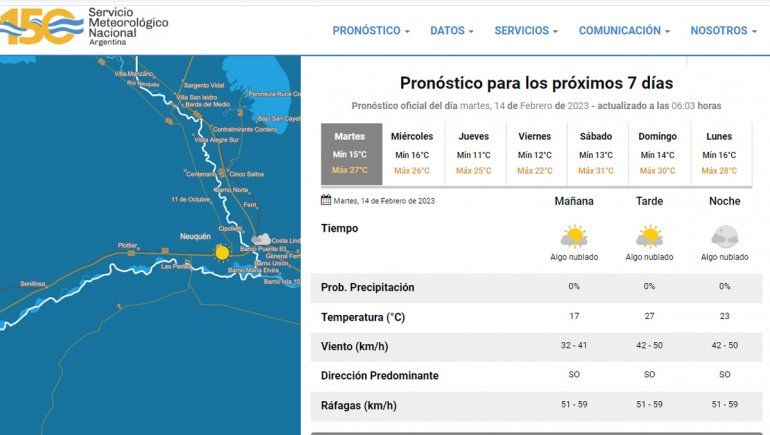 Según el Servicio Meteorológico Nacional (SMN), el cielo estará algo nublado durante todo el día, por la mañana la temperatura será de 17 grados y en horas de la tarde llegará a los 27 grados. Por la noche, cuando todos los valletanos tengan su atención en el edición de la Fiesta de la Confluencia, el termómetro estará en 23 grados. Habrá viento e irá de fuerte a muy fuerte con ráfagas de entre 51 y 59 kilómetros por hora a partir de la tarde.