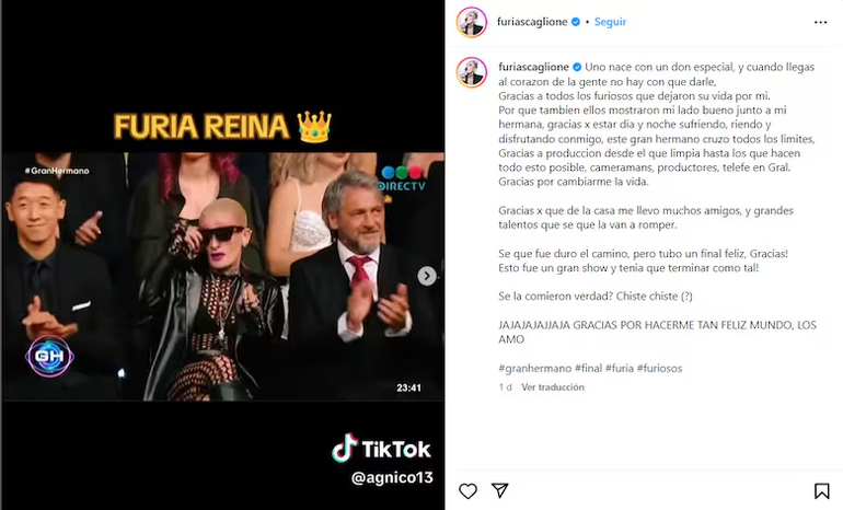 Gran Hermano 2023 llegó a su fin con Bautista Mascia como el gran ganador. Emmanuel Vich y Nicolás Grosman quedaron en segundo y tercer lugar, respectivamente, completaron así el podio del reality. Sin embargo, la que sigue dando que hablar hasta el día de hoy es Juliana 'Furia' Scaglione, quien, tras protagonizar un escándalo, salió a aclarar algunas en sus redes sociales.